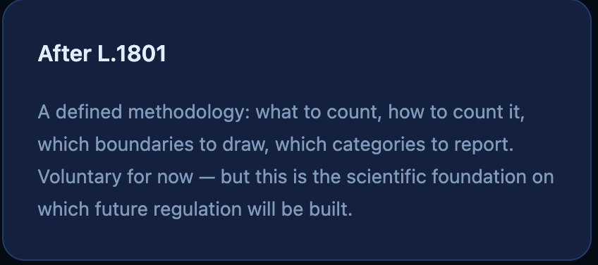 L.1801 addresses that directly. It establishes cradle-to-grave lifecycle phases, treats training and inference as fundamentally distinct activities, and covers five environmental impact categories — going well beyond carbon.